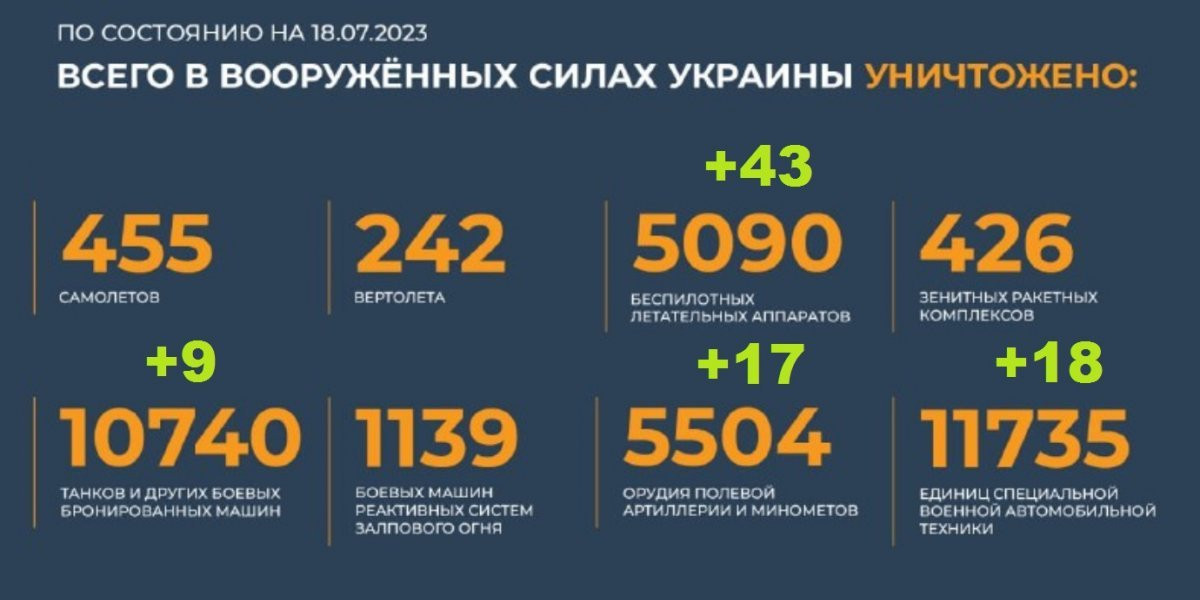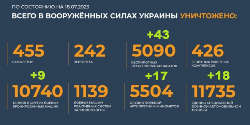 Потери Украины на сегодня 18.07.2023 Всего с начала проведения специальной военной операции уничтожены: 455 самолетов, 242 вертолета, 5090 беспилотных летательных аппаратов, 426 зенитных ракетных комплексов, 10740 танков и других боевых бронированных машин, 1139 боевых машин реактивных систем залпового огня, 5504 орудия полевой артиллерии и минометов, а также 11735 единиц специальной военной автомобильной техники.
