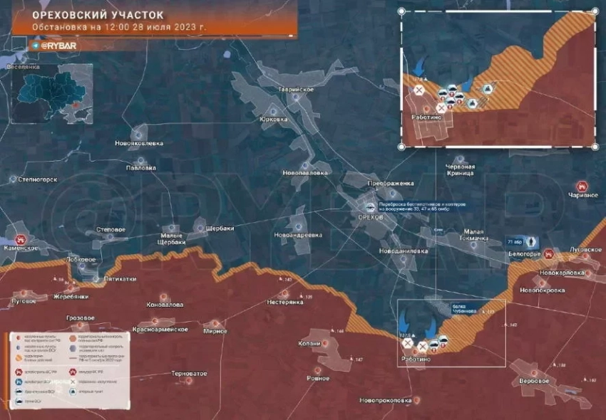 Весь вчерашний день ВСУ накапливали силы у дороги из Новоданиловки и к 21.00 начали движение на Работино на более чем десятке танков, БМП и ББМ. ВСУ попытались прорвать оборону бронетанковым кулаком, но бойцы 1430 и 71 мсп, а также 810 бригады морпехов ВС РФ встретили их огнем.