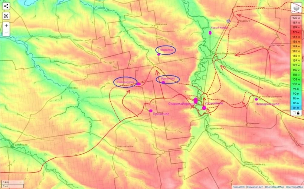 На западе российские войска добились значительных успехов в Лысовке, достигнув южного берега водоема. Освобождение Новогродовки сделало этот населенный пункт стратегически важным узлом обороны для украинских сил, расположенных к югу от Мирнограда. В настоящее время неясно, смогли ли российские штурмовики захватить северную часть села, где сосредоточена более плотная застройка. Продвижение на южном фланге откроет нашим войскам путь к восточным окраинам Даченского, что создаст серьезную угрозу окружения для украинских сил, находящихся в кармане между Лысовкой и Петровкой.