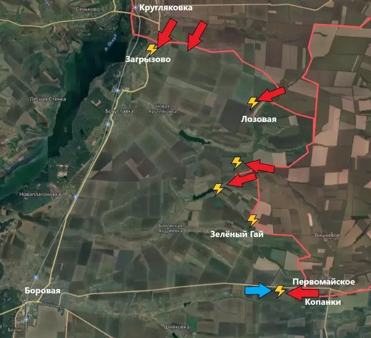На Боровском направлении штурмовые отряды ВС РФ зашли в Загрызово. Идут бои в северной части села. Продолжаются попытки взять Лозовую в клещи. Пока что на этом участке продвинуться вперёд не удаётся. Идут бои в районе населённых пунктов Первомайское и Копанки.