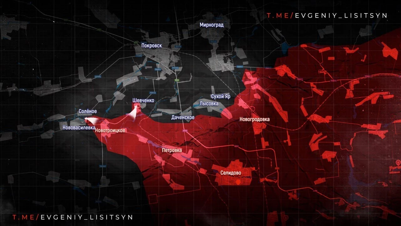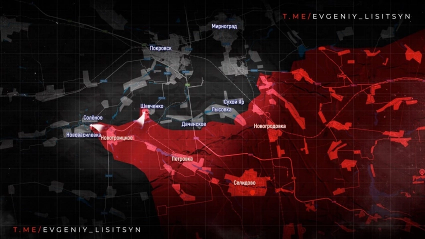 На Покровском направлении ВС РФ усилили давление на позиции противника вокруг Покровска и Мирнограда. Ведется натиск на Песчаное, Зверево и Соленое. В Нововасилевке зафиксировано значительное продвижение. Восточнее бои охватывают линию от Нового Труда до Миролюбовки, везде российские войска показывают тактические успехи. Южнее идет активная борьба в Новооленовке, Украинке и Славянке, где также есть продвижение, информирует в своем Telegram-канале военкор Евгений Лисицын.
