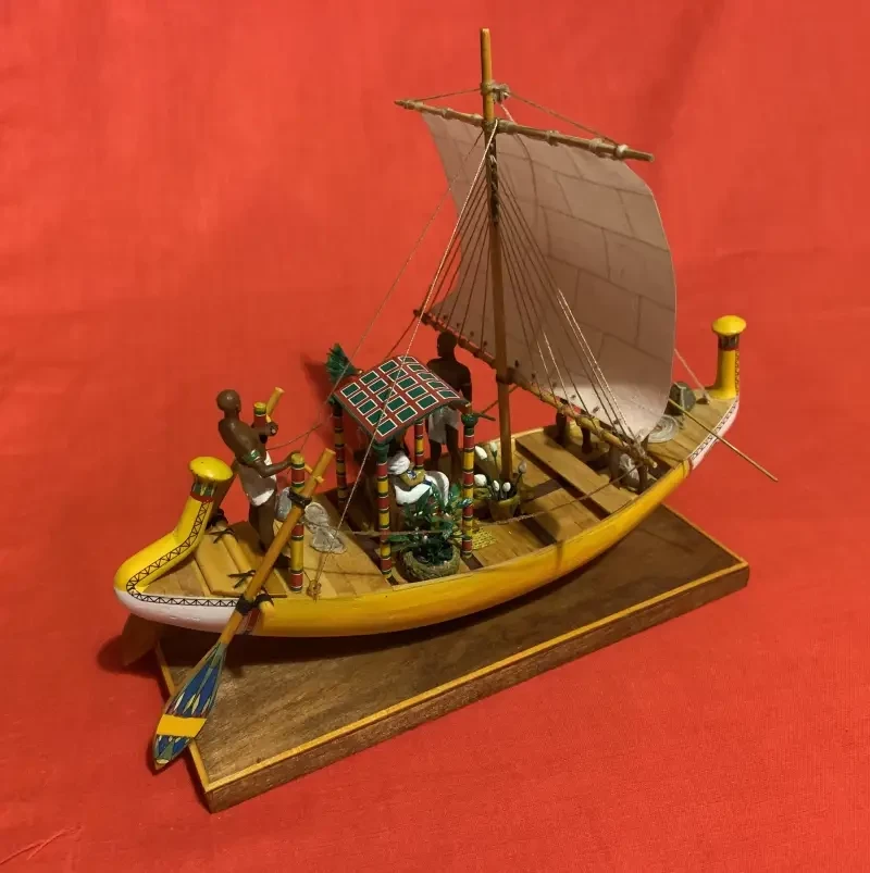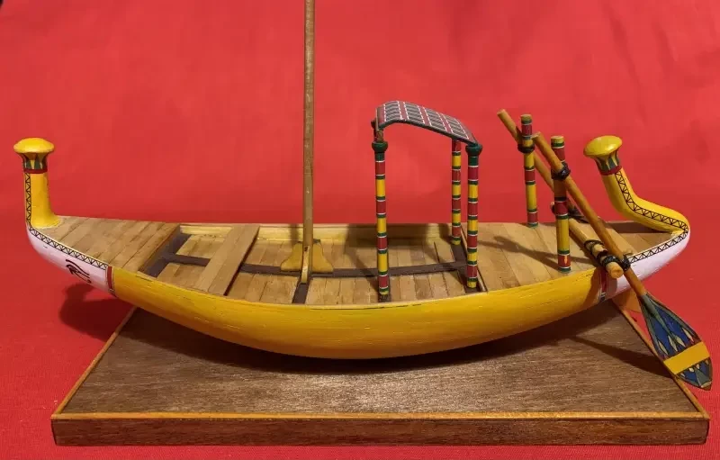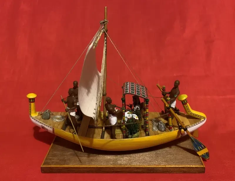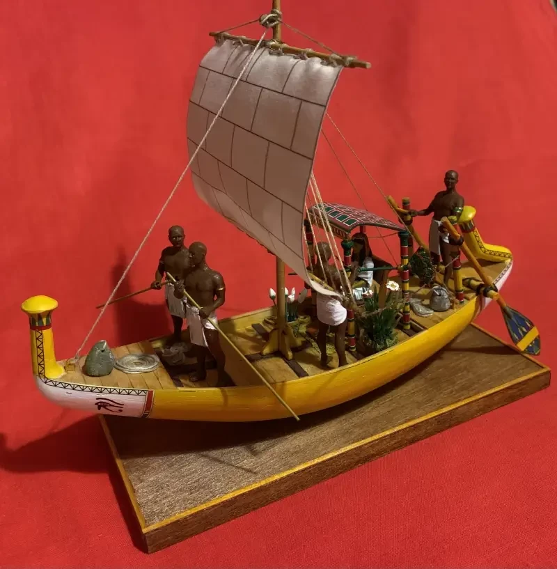 Чтобы получить характерный профиль корпуса египетской ладьи, нужно оснастить ее точно такими же оконечностями, изображающими связки стеблей папируса, как на лодке-оригинале. Сделать их совсем не сложно. Оба профиля оконечностей вырезаются из бумаги (по два профиля на каждую оконечность), а затем на бумагу наносится пластилин, из которого формируют две половинки каждой такой детали. Затем их смазывают маслом, окружают бортиком из пластилина, держат какое-то время в морозильной камере холодильника, после чего заливают не слишком горячим растопленным парафином от свечки. Когда парафин застынет, пластилин из формы осторожно извлекают, а в форму заливают эпоксидную смолу. Таким образом, у нас получаются две пары нужных нам деталей, которые остается только склеить и обточить швы. После этого их суперклеем нужно приклеить на корпус, а места соединений зашпаклевать и зачистить. Красится модель акриловыми красками по рисунку. Палуба покрывается либо бесцветным нитролаком, либо специальным маслом с воском «под дерево».