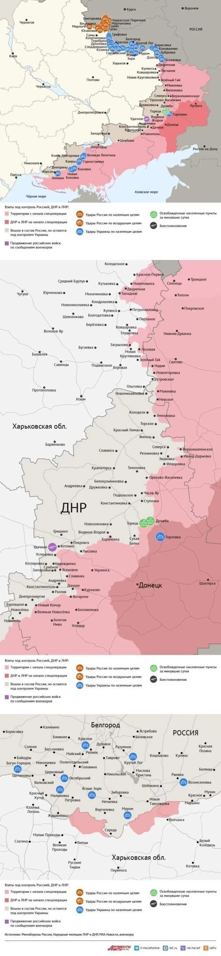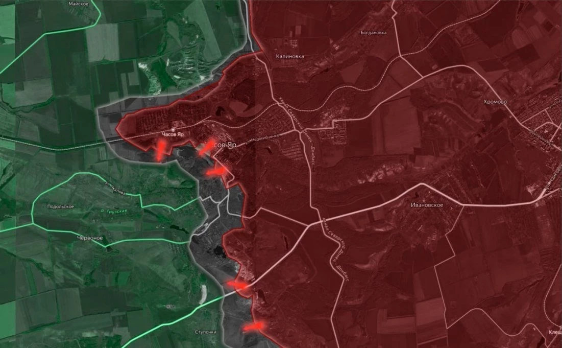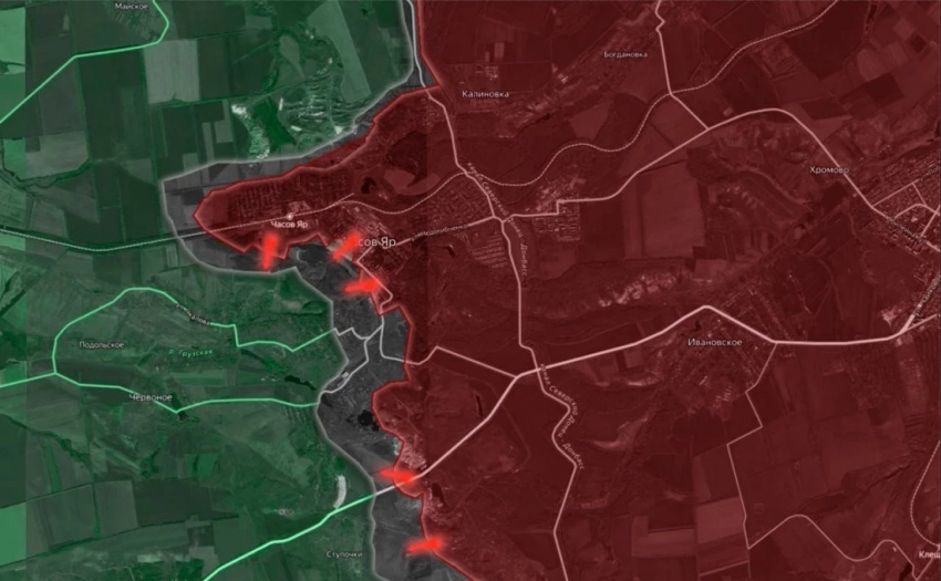 Продолжается битва за Часов Яр. С юга российские войска заняли урочища «Ступки» и «Кринички» на участке шириной более 3.5 км на глубину свыше 1.5 км, продолжая давить в направлении южной части Часов Яра и н.п. Ступочки. В самом Часов Яре ВС РФ продвигаются в микрорайоне «Новосеверный» и в застройке южнее «Часовярского огнеупорного комбината». Также российская армия активизировалась в районе трассы, ведущей в Константиновку.