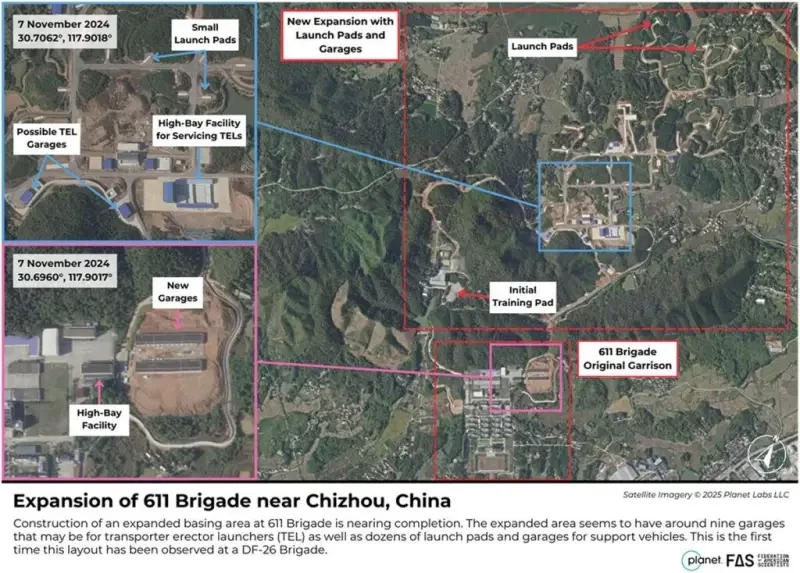 Рисунок 4. Расширение 611-й бригады около Чичжоу, Китай. 611-я бригада претерпевает значительное расширение в рамках включения баллистической ракеты средней дальности DF-26. Это включает уникальный гарнизон в форме круга, не встречающийся в других бригадах PLARF.