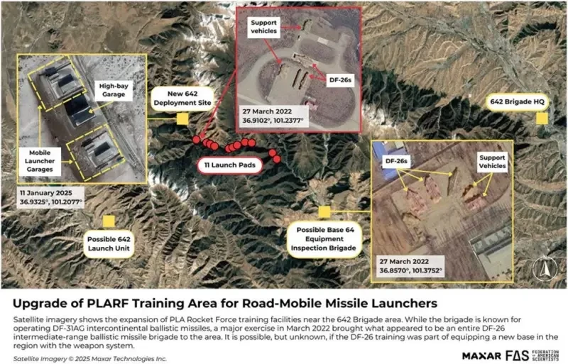 Рисунок 5. Спутниковые снимки, показывающие пусковые установки DF-26 и инфраструктуру ракет DF-31AG в районе 64-й базы. В марте 2022 года многие пусковые установки DF-26 провели учения в 64-й бригаде инспекции оборудования в Чану около Синина в провинции Цинхай.