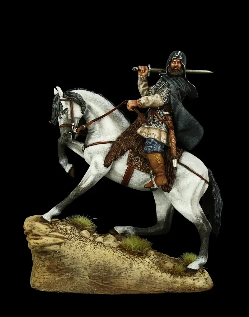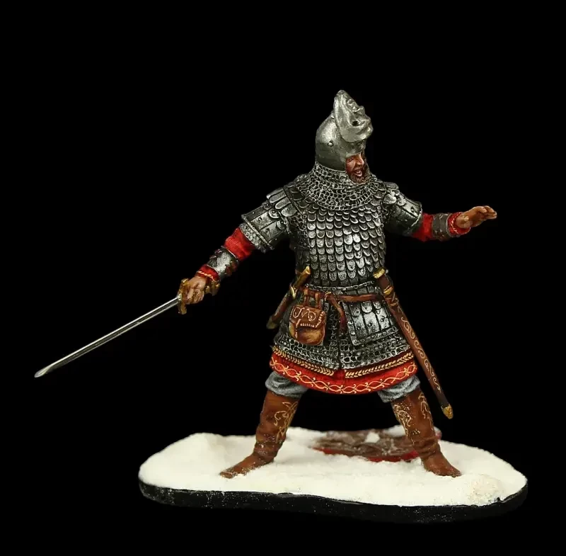А вот так Александр Невский вполне мог выглядеть на поле брани. Сабли в это время, кстати, уже появились, вот только насколько они были эффективны против кольчуг и чешуйчатых панцирей, сказать сложно. Производители: «Silver Dream Studio» и студия «Серебряная Ладья»