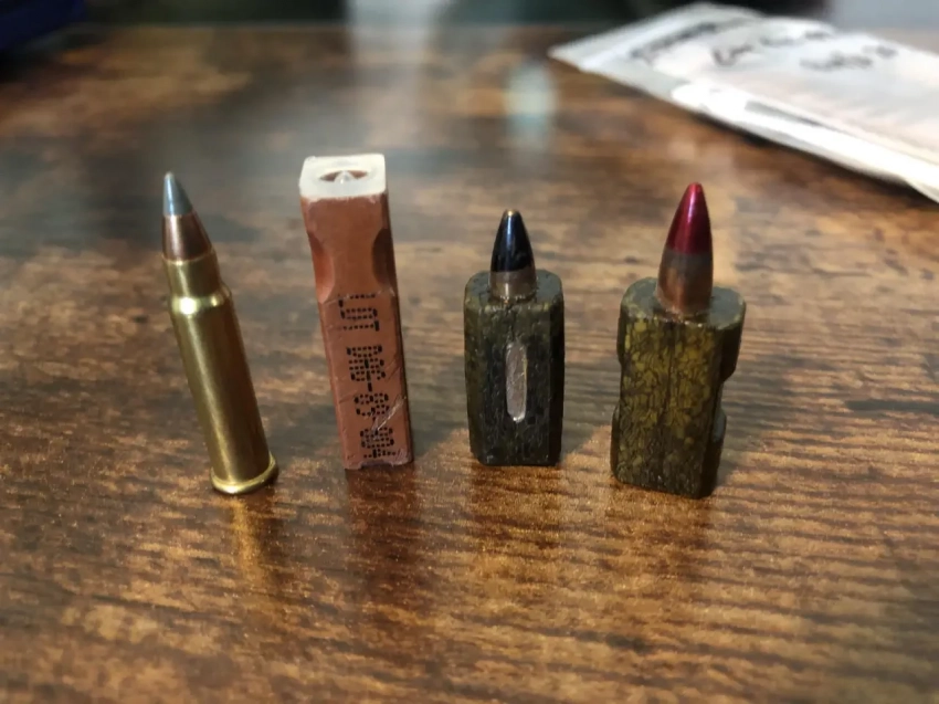 Эволюция боеприпасов к G11. Окончательный вариант в центре с маркировкой на «корпусе». Первоначально затвор не предполагался поворотным, потому в ранних вариантах боеприпаса пуля и не «утоплена» в порох полностью. Для сравнения рядом стоит патрон 17 Hornady Magnum Rimfire.