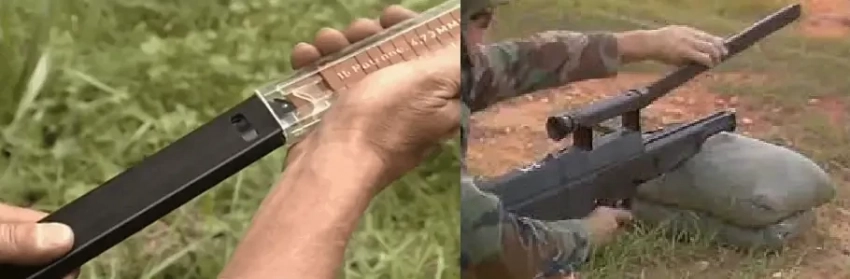 Пара кадров из видео с испытаний G11 в рамках американской программы Advanced Combat Rifle. Патроны поставлялись упакованными в пластиковые контейнеры. Виден процесс перезаряжания. Можно представить габариты магазина.