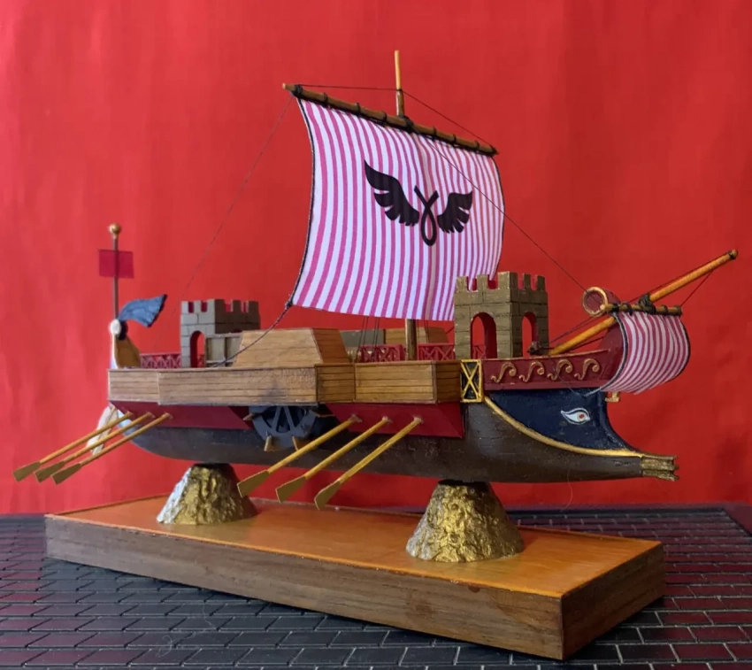 Сами стойки под модель – картонные конусы, вырезанные из упаковки для яиц, залитые эпоксидной смолой и раскрашенные под бронзу. Вёсла – китайские зубочистки. Перила – склеены из реек 2х2 мм. Красивые завитки на носовом фальшборте вырезаны из полистиролового веера, так же как и детали новогодней кареты, о которой здесь уже как-то рассказывалось. Глаза на носу нарисовать от руки представляется делом совершенно невозможным. Но их можно заказать в типографии, где делают термонаклейки, и перевести на место при помощи паяльника, поставленного на самый малый нагрев.