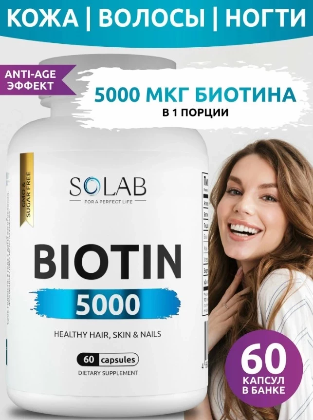 Биотин 5000 мкг витамины для женщин, SOLAB комплекс восстановления волос, Витамин H, 60 шт