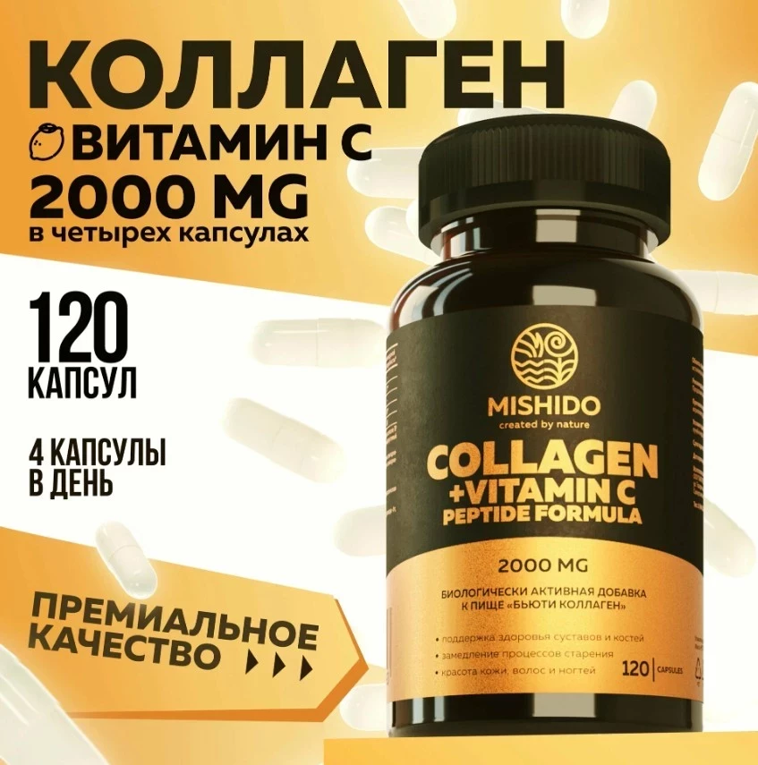 Коллаген и Витамин С MISHIDO 120 капсул, гидролизованный пептиды 2000 мг Beauty Collagen