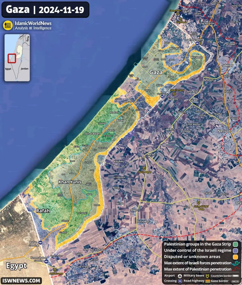 Несколько карт контролируемой израильтянами зоны в секторе Газа за февраль, июнь и ноябрь 2024 года. Из этих карт вполне очевидно, что израильтяне уже захватывали большую часть сектора Газа, а потом откатились назад. Это почему? От больших успехов?