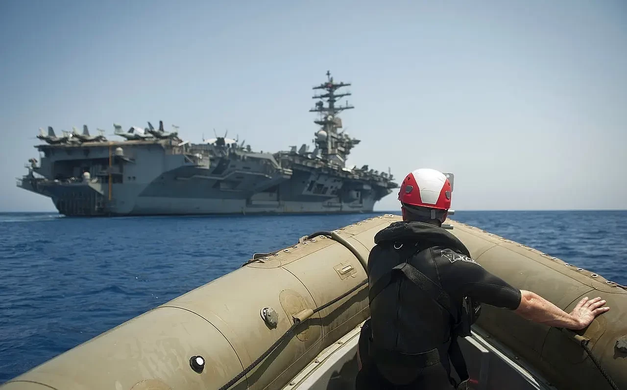 Авианосец и три сопровождающих его ракетных эсминца вошли в Аравийское море. Там же вблизи берегов Омана курсирует авианосная ударная группа в составе атомного авианосца USS Carl Vinson, ракетного крейсера и двух эсминцев.