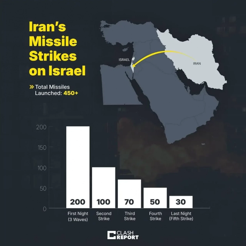 Даже если предположить, что эта цифра завышена вдвое, в любом случае военному потенциалу Ирана был нанесен существенный ущерб. Если посмотреть инфографику интенсивности ударов и попаданий иранских ракет по Израилю, то по всему выходит, что интенсивность ракетных обстрелов Израиля в течение первых пяти дней конфликта постепенно снижалась. За пять ночей залпы деградировали с 200 баллистических ракет в первую ночь до 30 в последнюю. В дальнейшем на протяжении конфликта Иран больше никогда не выпускал больше 30 баллистических ракет за раз.