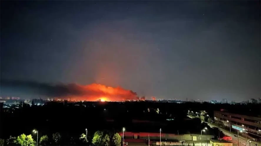 Пожар фиксируется на месте ракетного удара по району расположения аэропорта Борисполя, превращённого в перевалочный узел для военных грузов, поступающих из-за рубежа.