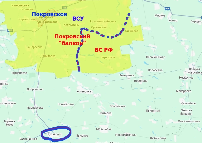 Как ранее отмечалось, продвижение к северу от Гуляйполя может привести к охвату городу - подобно тому, как это было сделано нашей армией в отношении Покровска (Красноармейска) на западе ДНР.