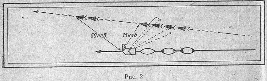 Спустя несколько минут головные торпедные катера повернули «все вдруг» на караван. Вслед за ними через 30 сек. остальная группа также «все вдруг» повернула в сторону конвоя и полным ходом пошла в атаку. Быстроходный тральщик открыл огонь по основной ударной группе (4 торпедных катера). Снаряды ложились накрытием. Торпедные катера, не выдержав отличного прицельного огня с тральщика, произвели торпедный залп по нему и одному из судов (рис. 3) с дистанции 17 (головная группа) и 20 кабельтовых (основная ударная группа).