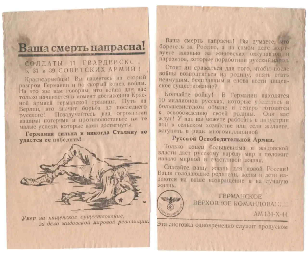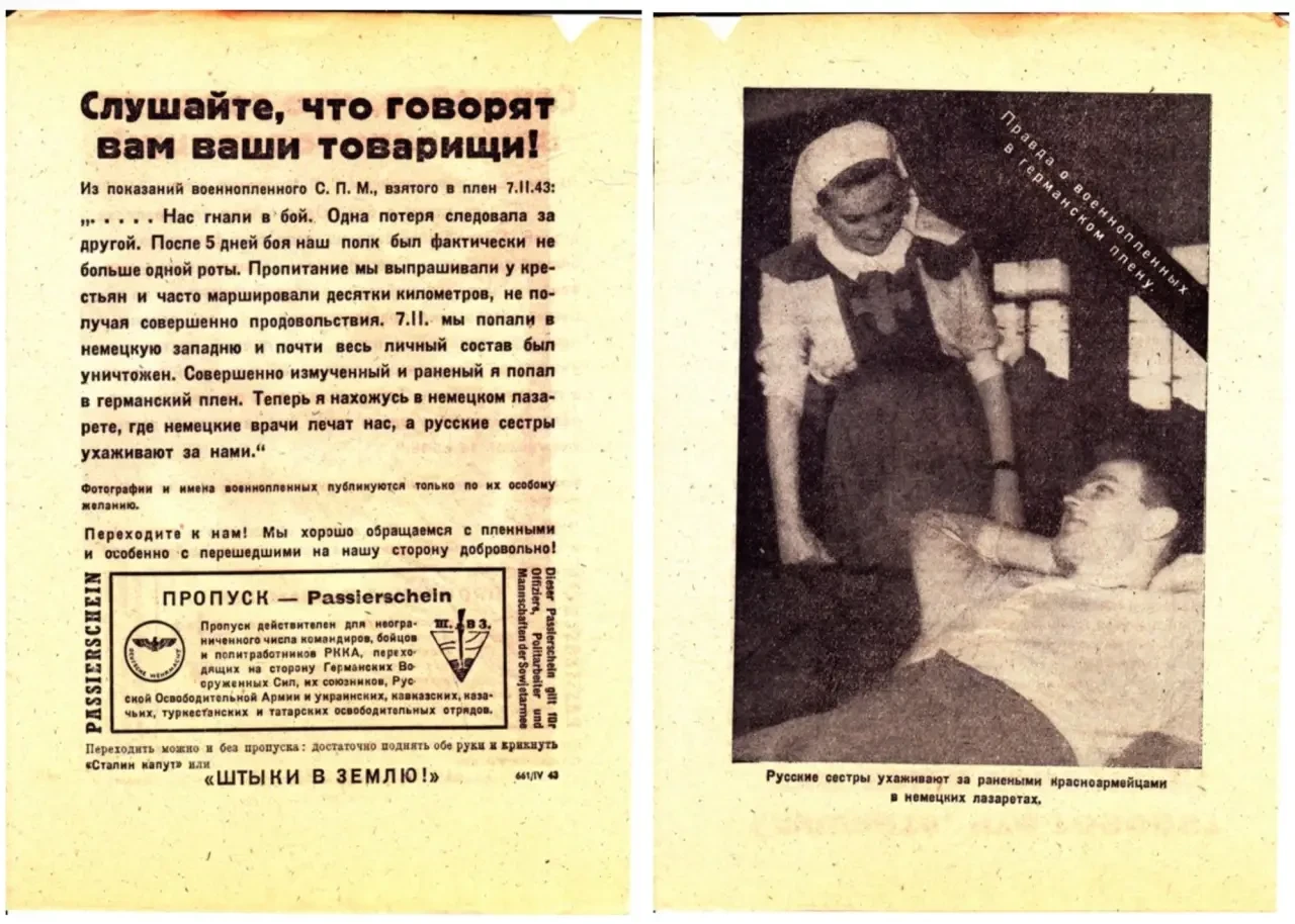 Были и более изобретательные средства, например, распространялись книжечки с названием «Не только тебе, но и твоим товарищам» со множеством отрывных пропусков и карикатур. Также нужно упомянуть о листовках, в которых объявлялось о том, что в рядах Красной Армии много врагов Сталина и солдат, сотрудничающих с немецкой армией. В них давалась рекомендация вступить в коммунистическую партию, «быть образцовым коммунистом», чтобы отвести от себя подозрения командиров в нелояльности советской власти, чтобы таким образом легче перейти к немцам.