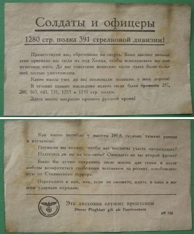 Помимо этого, присутствовали пропагандистские материалы, содержащие имена солдат и офицеров, которые были известны бойцам конкретных формирований Красной Армии. Достаточно часто применялся такой прием, как обращение взятых в плен к товарищам из своей собственной части.