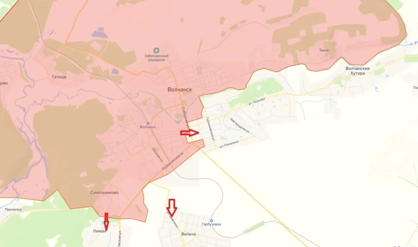 Подразделения ВС РФ уже заняли рубежное шоссе, а также продвинулись на восток мимо памятника самолету Л-29. Продолжаются боестолкновения у ангаров на самом юге города. К югу от Волчанска армия России зачистила Синельниково и лесополосы между Синельниково и Вильчей, окончательно закрепив результат на этом участке. Дорога в Волчанск с юга полностью перерезана и недоступна для использования противником. С развитием успеха к югу от Волчанска ВС РФ смогут приблизиться к переправе в Старом Салтове. На восточном фланге продолжаются бои в лесополосах в районе Амбарного, Отрадного и освобожденного недавно Двуречанского.