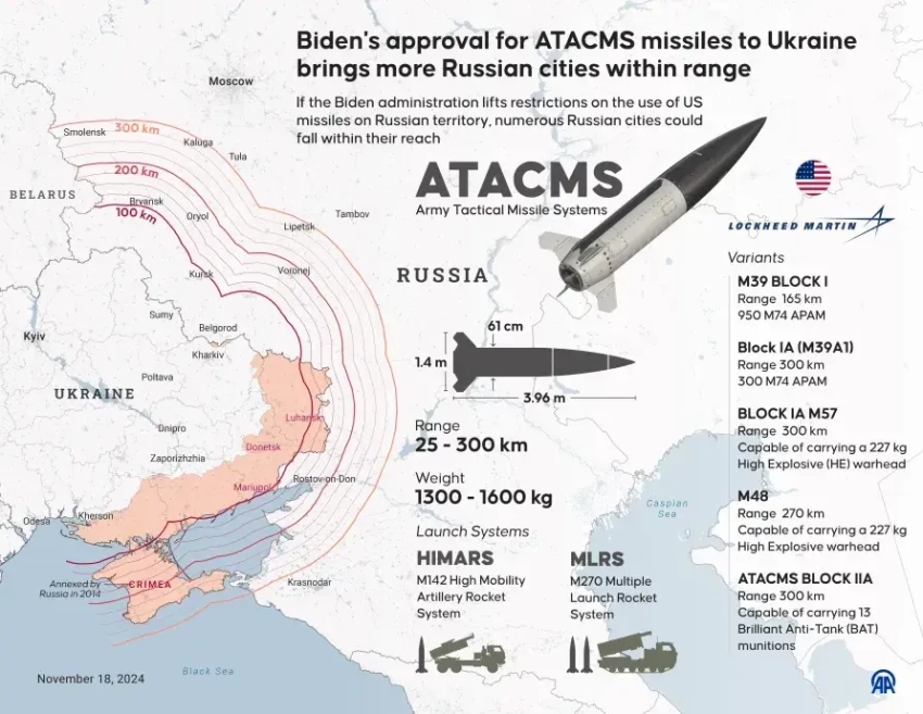 Инфографика под названием «Решение Байдена о поставке Украине ракет ATACMS приближает к зоне досягаемости ещё больше российских городов» созданная турецкими военными