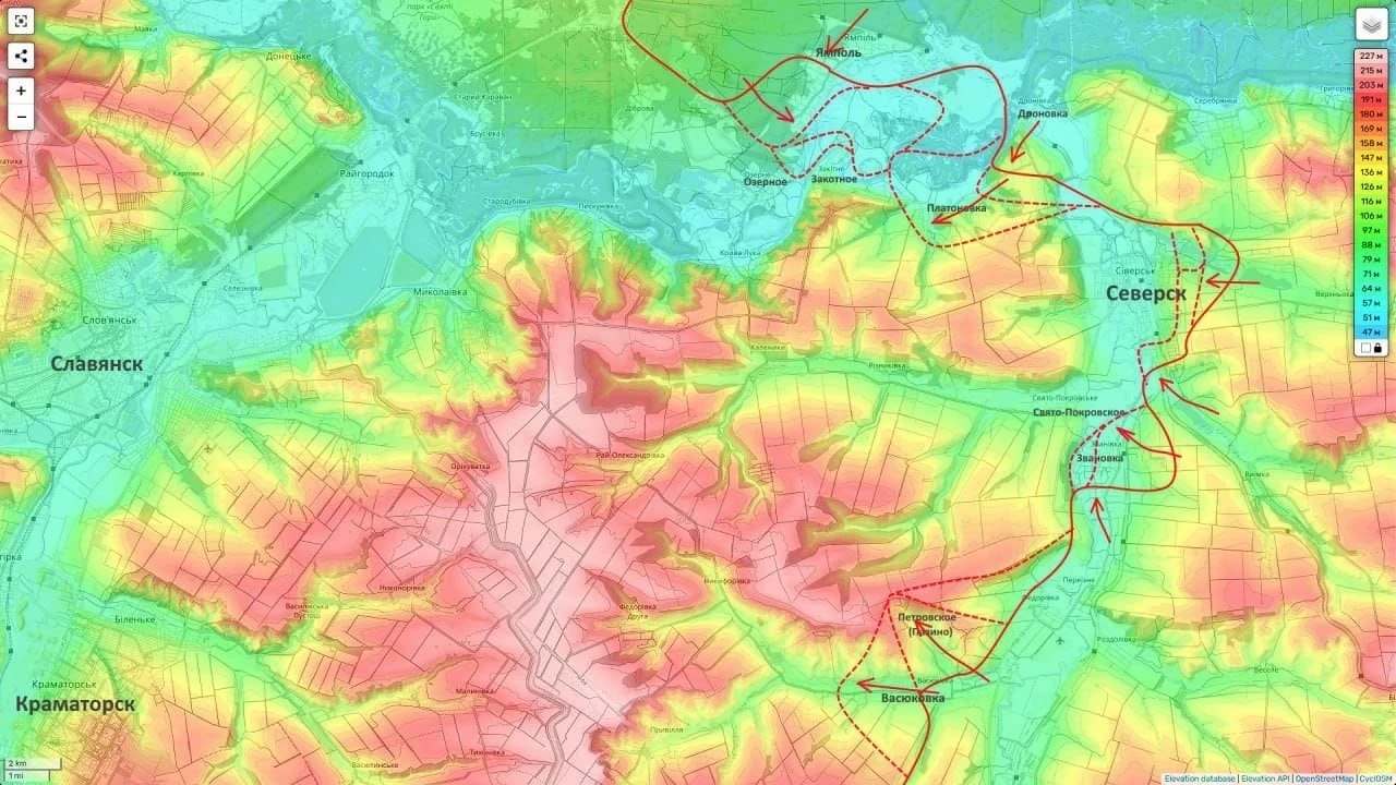 Горловина снабжения восточнее Ямполя сужена до 3+ км, до физического контроля разрушенного моста западнее Закотного — менее 500 м. Идут ожесточённые бои за опорники южнее Ямполя и высоты южнее Закотного; выход на эти высоты создаст оперативное окружение Северска и откроет путь на Славянск.
