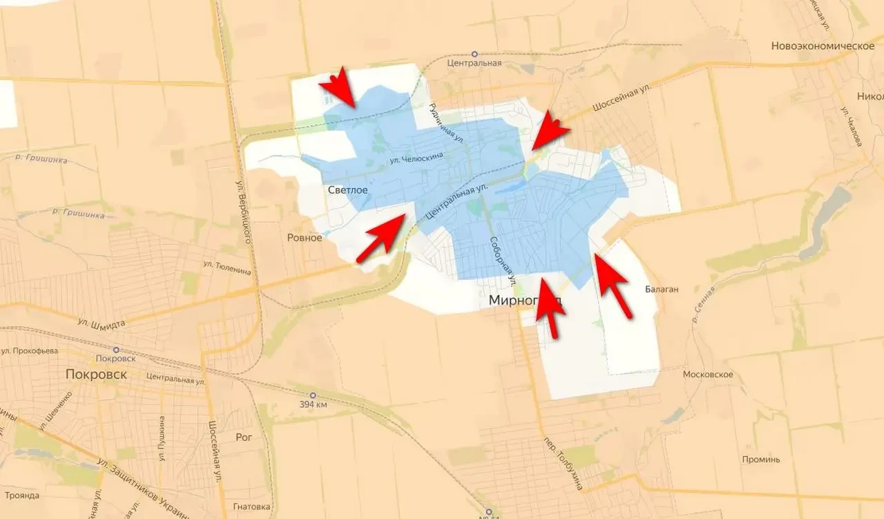 Российские войска выбили украинские формирования из южной части Мирнограда, в Генштабе ВСУ подали это как «совершение маневров» с целью «выравнивания фронта». В Киеве продолжают утверждать, что никакого окружения в Мирнограде (Димитрове) якобы нет.