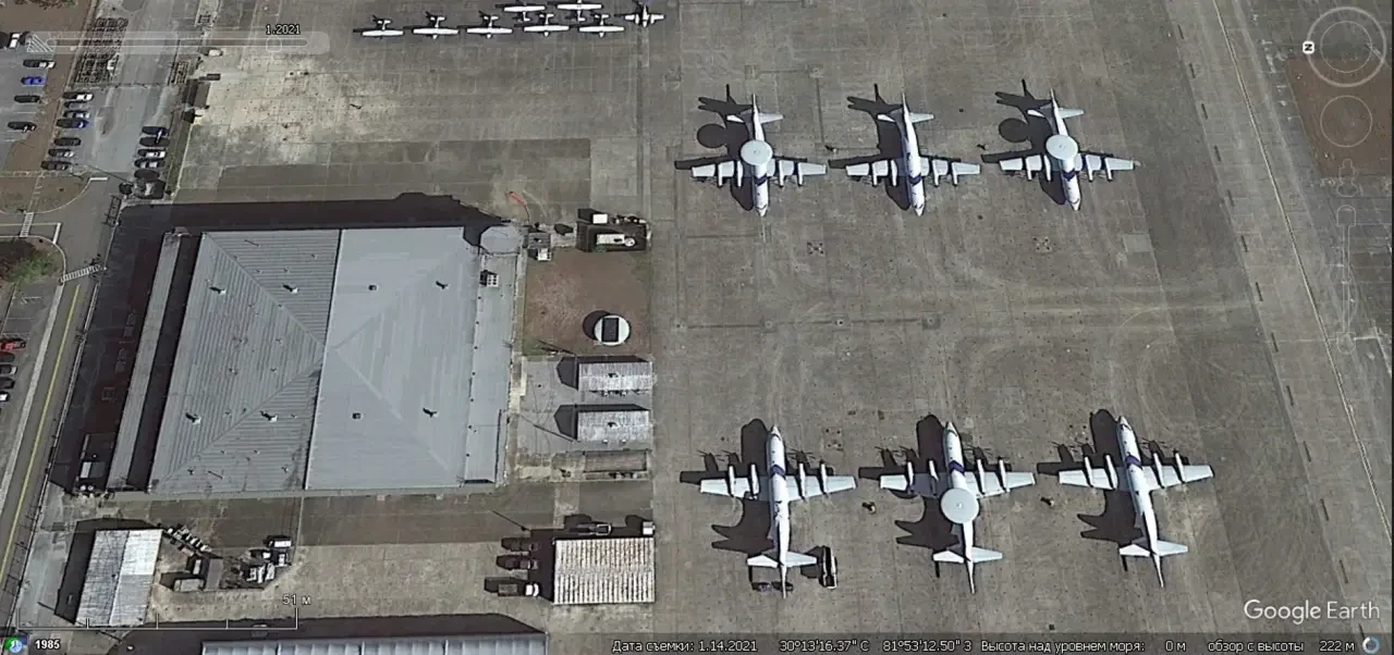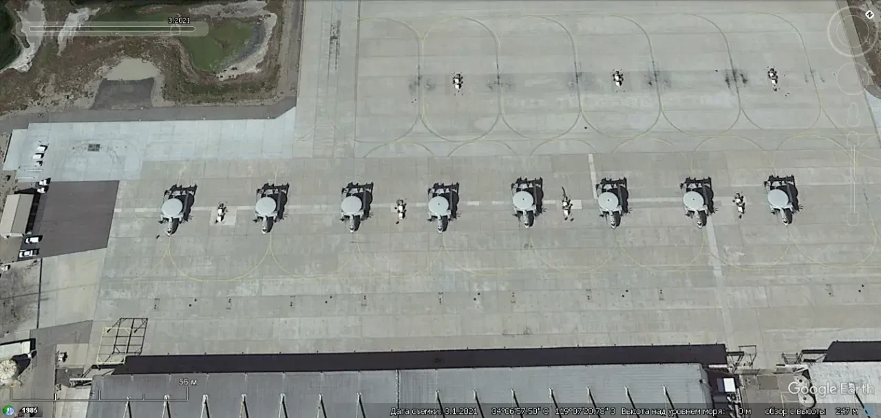 Спутниковый снимок Gооglе Eаrth: самолёты Northrop Grumman E-2С/D Hawkeye/ Advanced Hawkeye на авиабазе Пойнт-Мугу. Снимок сделан в марте 2021 года