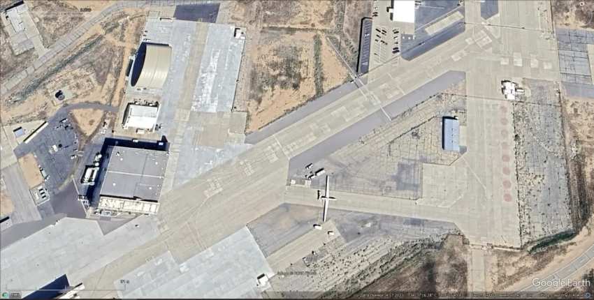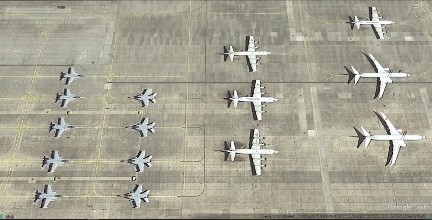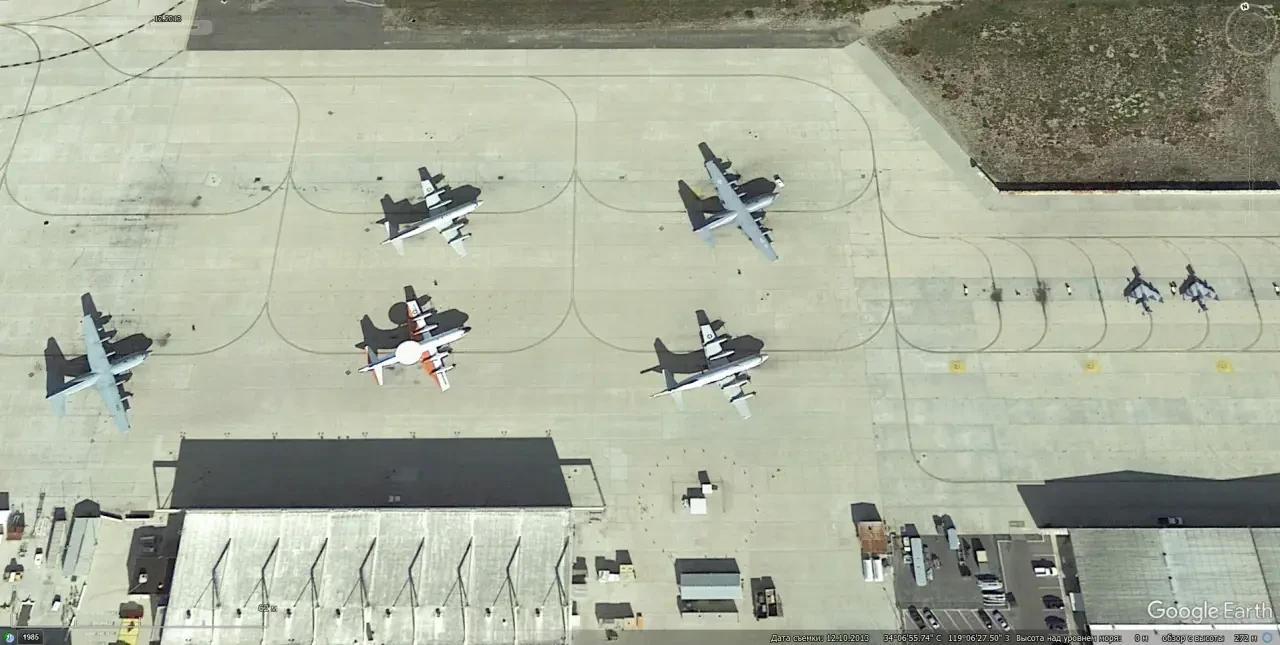 Спутниковый снимок Google Еаrth: базовые патрульный самолёт Lockheed P-3 Orion, самолёт ДРЛО раннего выпуска P-3 AEW, военно-транспортные Lockheed C-130Н Hercules и истребители Hawker Hunter на авиабазе Пойнт-Мугу