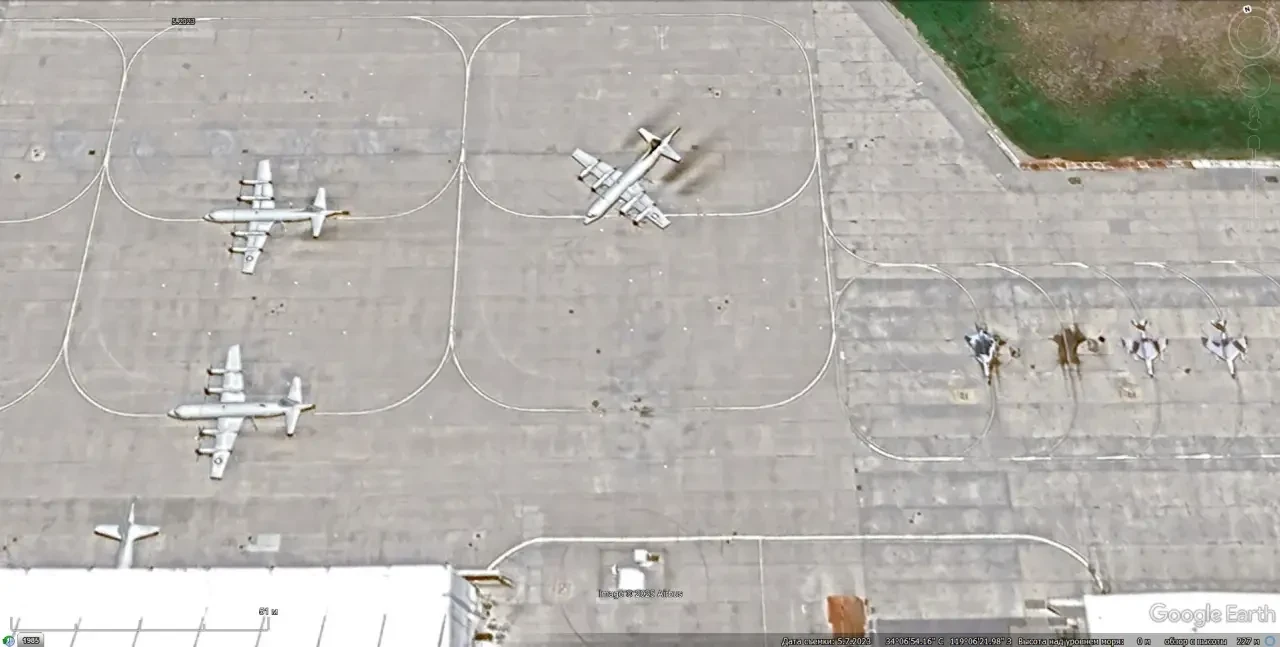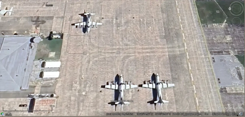 Спутниковый снимок Gооglе Eаrth: самолёты Lockheed P-3С Orion, а также истребители IAI Kfir и Hawker Hunter на авиабазе Пойнт-Мугу