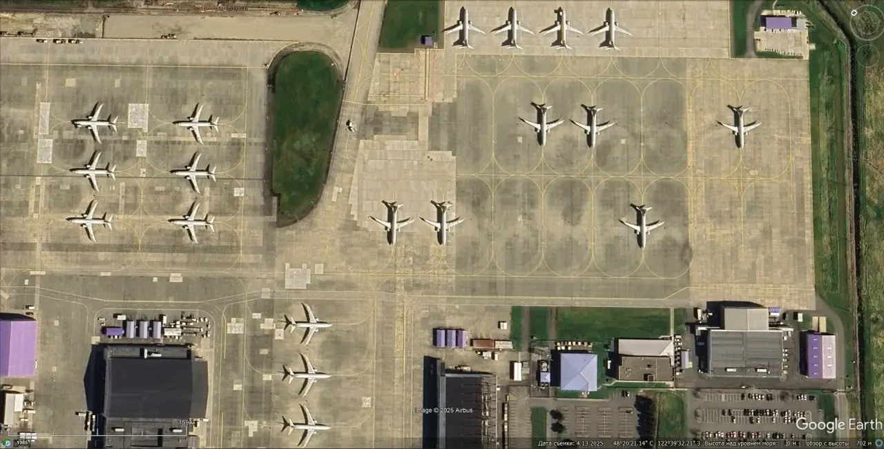 Спутниковый снимок Gооglе Eаrth: территория завода Boeing в Рентоне. Снимок сделан в июле 2024 года