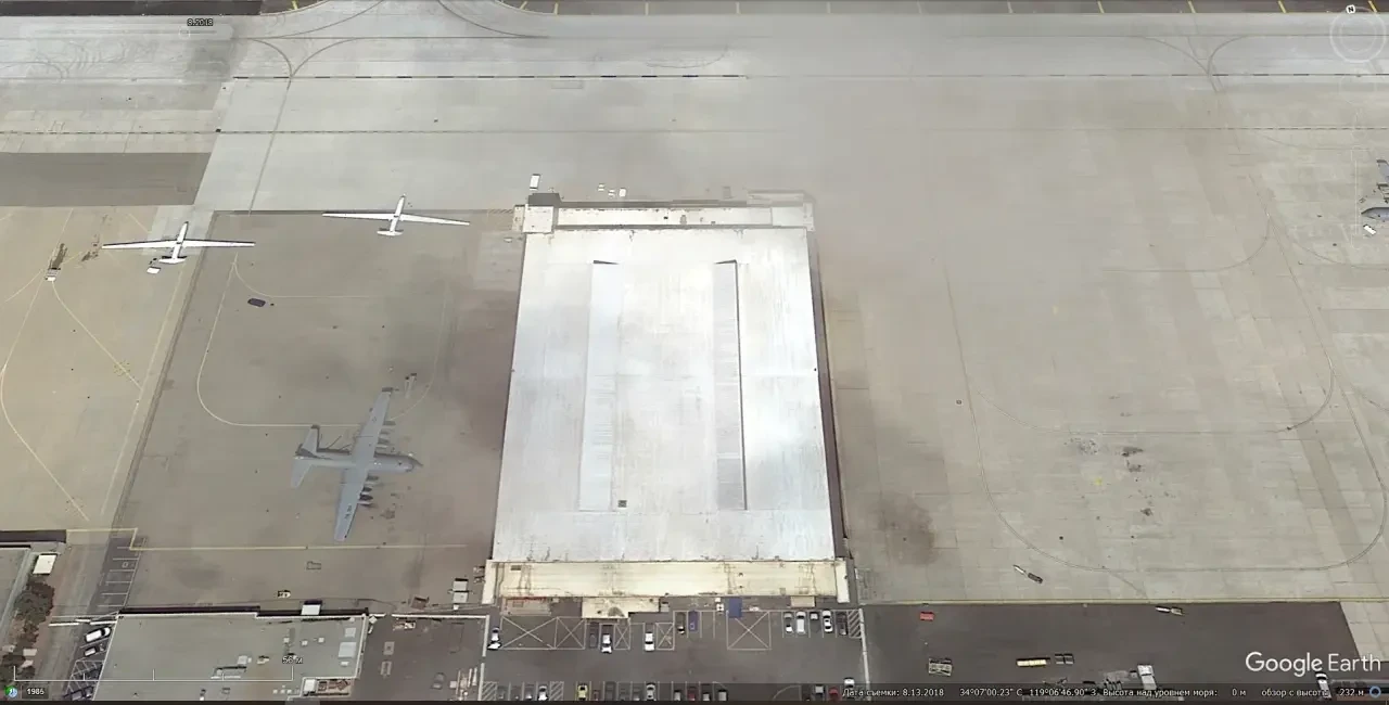 Спутниковый снимок Gооglе Eаrth: БПЛА Northrop Grumman MQ-4C Triton и военно-транспортный Lockheed C-130Н Hercules на авиабазе Пойнт-Мугу. Снимок сделан в августе 2018 года