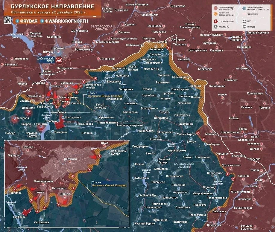 На Харьковском участке фронта МО РФ сообщило об освобождении Вильчи.Отсюда можно двигаться в сторону Великого Бурлука у Купянску или на юг к Пологам. Бои идут в Прилипке и лесах западнее Лимана. В районе Старицы ВС РФ выбили противника из нескольких опорников. В Волчанских Хуторах есть тактические успехи.