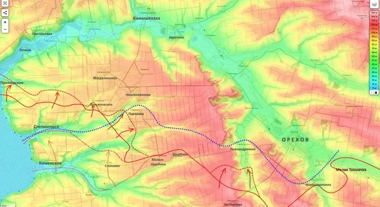 По словам эксперта, под контроль РФ практически перешло соседнее Приморское, в котором тоже шли бои. Также серьёзное продвижение фиксируется севернее Степногорска. Кроме того, начался штурм Лукьяновского. Российские военные, прогнозирует Подоляка, в ближайшие дни освободят село. Кроме того, на юго-востоке участка штурмовики зашли в южные окраины Новоандреевки из Нестерянки.