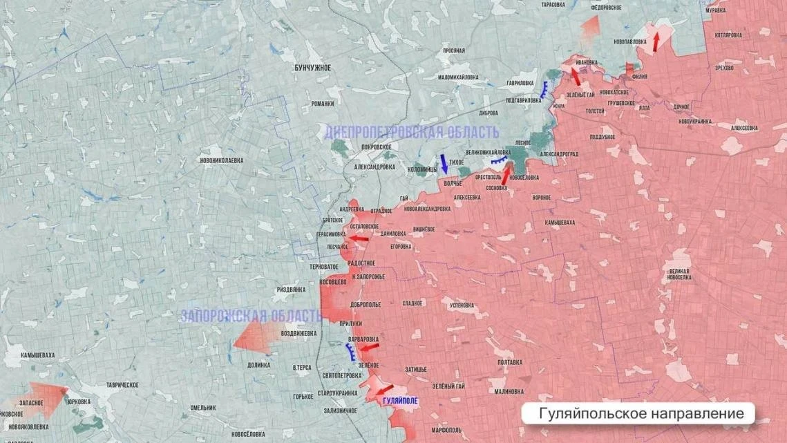 На Гуляйпольском участке ВСУ не снижают интенсивность безрезультативных накатов на Гуляйполе. Наши захватили новые позиции в лесах южнее города, в районе Дорожнянки. Кроме этого, противник отмечает российское продвижение на западе от города, в районе Зализничного и Староукраинки. Российские группы зафискированы в районе Косовцево и Терноватого. Есть успехи в районе Филии. Идут бои за северную и северо-западную часть Новопавловки, южнее села расширена зона контроля. Закрыт «карман» на северо-западе от Орехово.