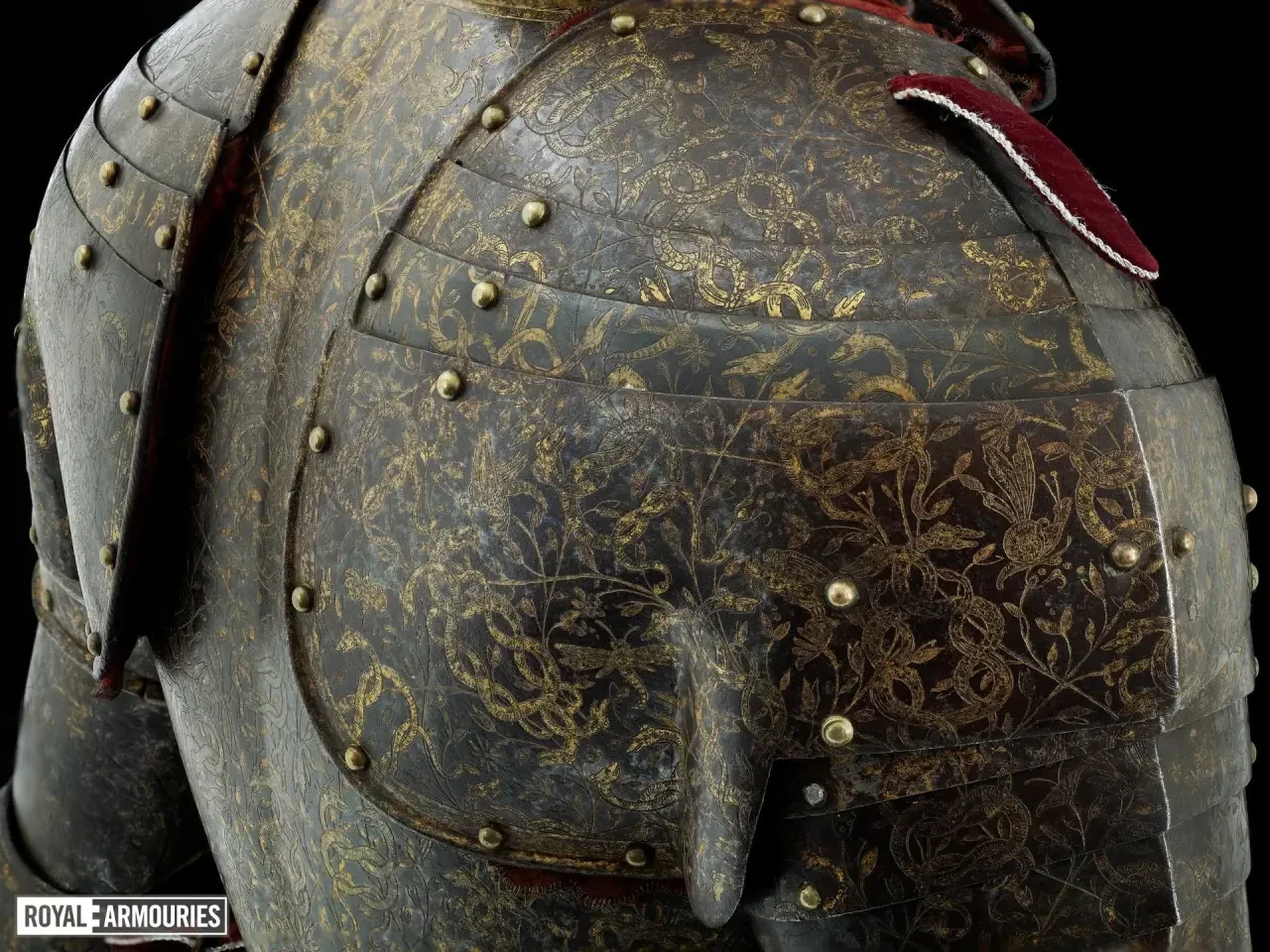На каждом плече есть ремень для крепления наплечников. Нагрудник представляет собой цельную тяжелую пластину выпуклой формы, напоминающую гороховый стручок, с острым срединным килем и широким фланцем на талии, с центральным выступом. Задняя пластина, плавно повторяющая форму позвоночника, имеет широкий фланец на талии. Спина и нагрудник крепятся ремнями на каждом плече к простым позолоченным железным пряжкам на плечах нагрудника, а также ремнями на талии с обеих сторон талии задней пластины, застегивающимися на литую латунную пряжку, аналогичную пряжке на беворе. Нагрудник имеет четыре ремня для набедренников, задняя пластина — три для кулета — защиты нижней части спины и ягодиц.