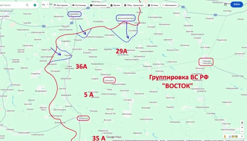 Направление удара: Из района Великой Михайловки на Сосновку и Березовое (основной вектор), а также из Покровского на Новоалександровку.