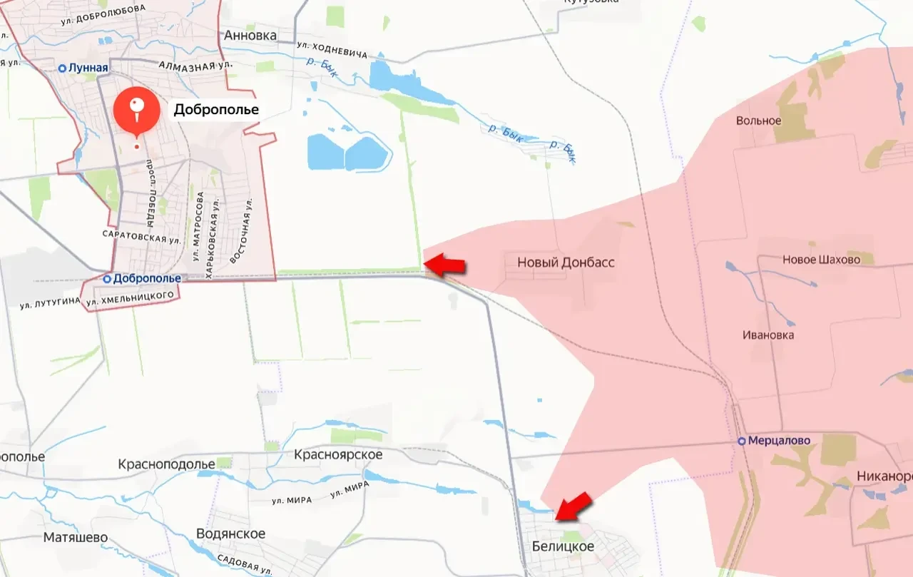 Также российские штурмовые группы при поддержке дроноводов и артиллерии вышли к железной и автомобильной дорогам, которые соединяет Доброполье с городом Белицкое. В такой ситуации беспрепятственный трафик ВСУ между двумя городами перестал быть возможным. Снабжение гарнизона противника в Белицком ведётся теперь главным образом по дороге через Красноподолье и Красноярское.