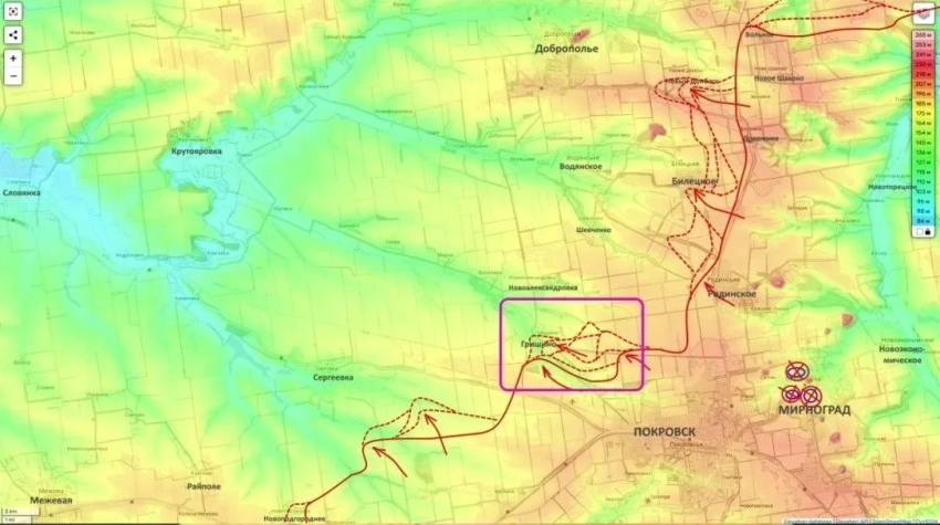 В свою очередь на участке группировки «Центр» идут тяжёлые встречные бои. Российские подразделения опираются на Ивановку и предпринимают попытки выйти к восточным окраинам Гавриловки. Однако основные события разворачиваются севернее - в районе Покровска, Мирнограда и Белицкого.