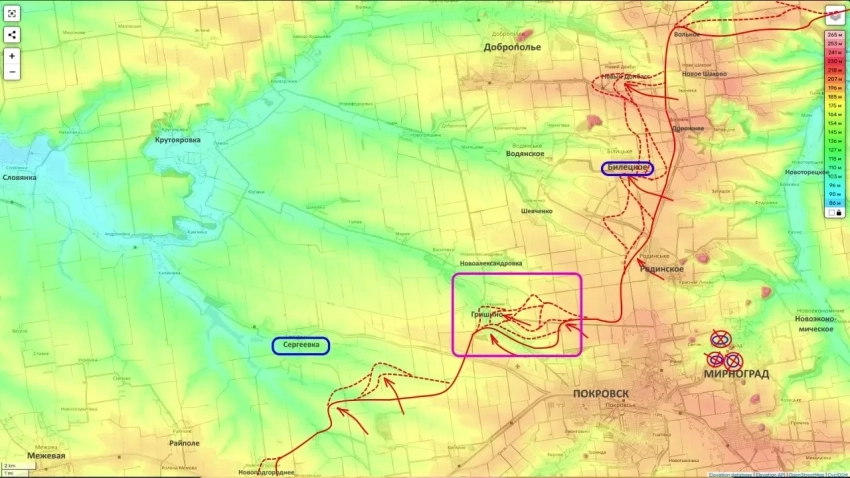 Начинается плотное давление на Сергеевку. Опираясь на большую Покровско-Мирноградскую агломерацию, российские войска наращивают темп. Под таким давлением оборона противника рано или поздно должна дрогнуть.