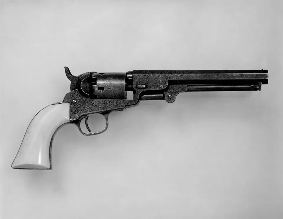 7. «Кольт», модель 1849 года, но выпущен в 1853 году. Хартфорд, штат Коннектикут. Материалы: сталь, латунь, серебро, слоновая кость Длина ствола 15,24 см. Калибр 8 мм
