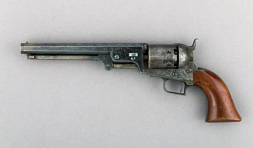 2. Револьвер «Уэллс Фарго». Тоже револьвер Кольта. Выпущен примерно в 1851 году. Материалы: сталь, серебро, красное дерево! Длина 222 см, длина ствола 10,2 см, калибр 7,9 мм. Вес 618 г