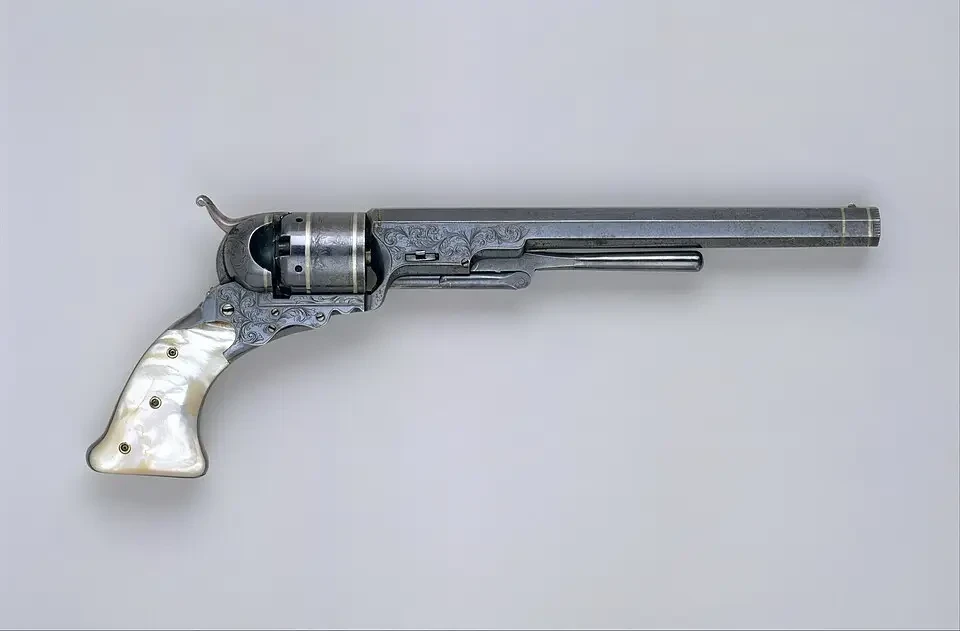 14. «Кольт-Патерсон» частый гость в статьях про револьверы Сэмюэля Кольта, но вот фото такого «Патерсона» встречаются редко. Это «Патерсон» № 3. Выпуск 1838 г. Производство в Патерсоне, Нью-Джерси. Материалы: сталь, серебро, перламутр. Длина 42,55 см. Длина ствола 30,48 см. Калибр 10,2 мм