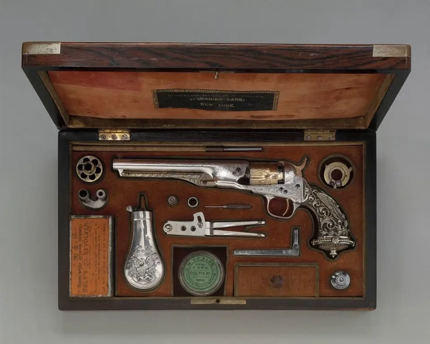 21. Еще один подарочный кольтовский револьвер той же третьей модели в красивом футляре вместе с принадлежностями. Подобные револьверы были изготовлены в специальной мастерской Кольта и затем подарены императору Николаю I с целью завоевать его расположение и добиться выгодных поставок своего оружия для российской императорской армии. Год выпуска: 1848. Материалы: сталь, золото, дерево. Длина 24,8 см, длина ствола 12,7 см. Калибр 7,9 см. Вес 671,9 г