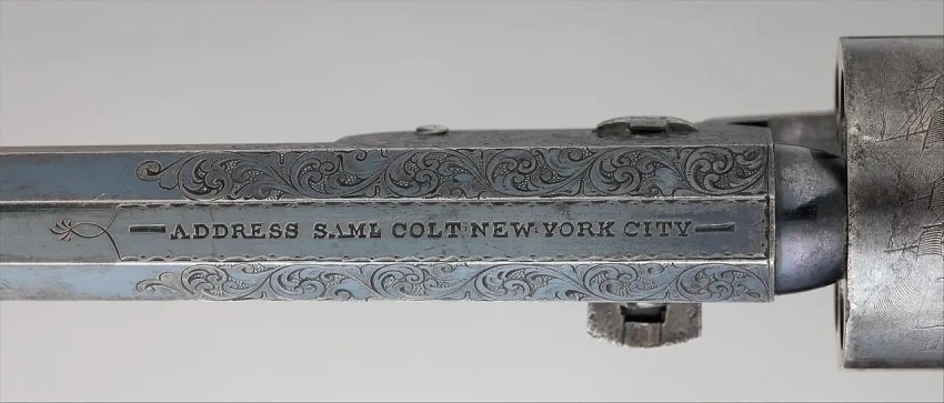 15. «Кольт-Патерсон», но уже с добавленным под ствол рычагом для тугой забивки пули. Материалы: сталь, серебро, перламутр. Ок. 1840 г. Длина 35,56 см, длина ствола 22,86 см. Калибр 10 мм