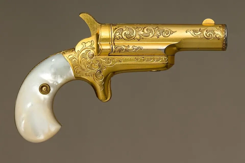 18. «Кольт-Дерринджер», ок. 1870 г. Материалы: сталь, золото, перламутр. Длина 11,7 см, длина ствола 5,9 см. Калибр 10,4 мм. Вес 198,5 г