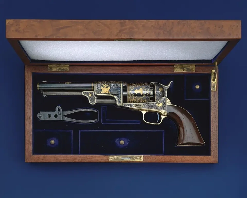 3. Армейский ударный револьвер «Кольт» М 1860, серийный номер 7569, с аксессуарами, произведенный на предприятии в Хартфорде, штат Коннектикут. Год выпуска: 1861. Материалы: сталь, латунь, серебро, золото, красное дерево, текстиль. Длина 36,83 см, длина ствола 20,32 см. Калибр 11 мм