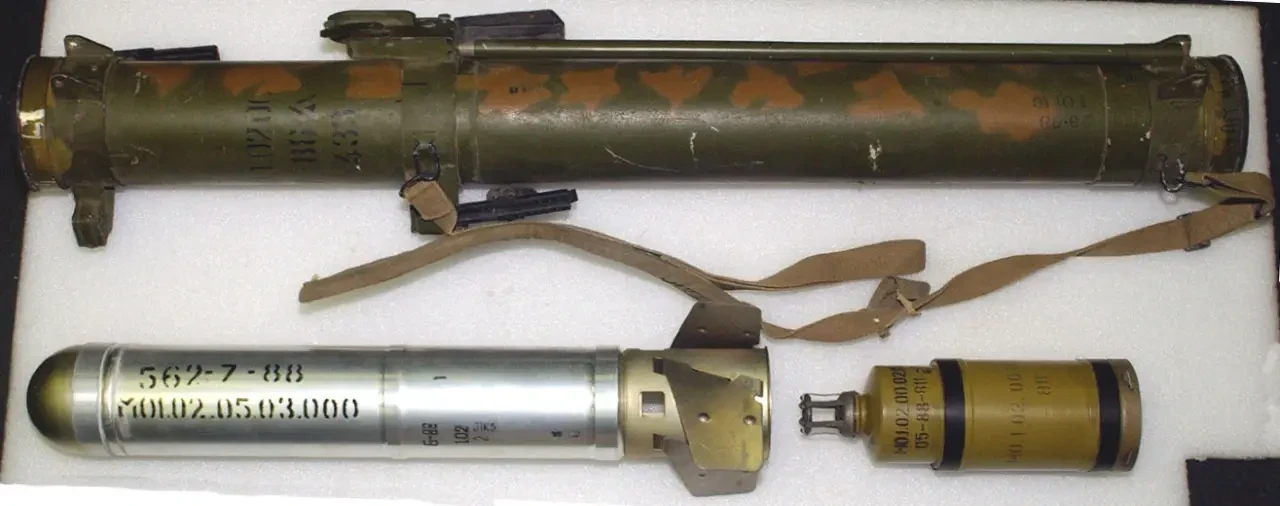 Реактивный огнемёт РПО-А. Вверху — пусковая труба, внизу — боеприпас с двигателем