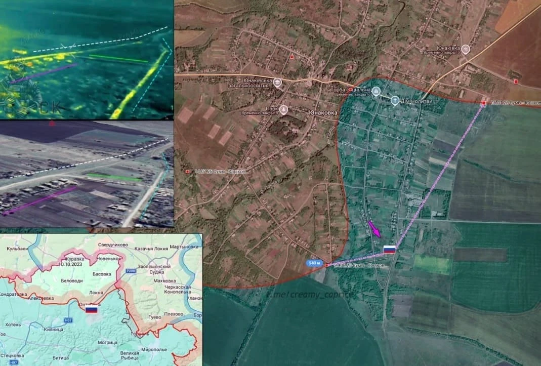 В районе Юнаковки и Алексеевки российские войска охватывают Малую Корчаковку с севера, ведя активные бои. В самой Юнаковке ВС РФ увеличили зону контроля, заняв новые позиции на южной окраине посёлка с продвижением около 500 метров. На Глуховском участке продолжается расширение зоны безопасности в районе села Сопычь, где противник предпринимает попытки контратаковать, но безуспешно.