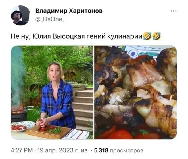 Юлия Высоцкая/Фото: vysotskayaofficial/TelegramВ 2023 году в сети завирусились архивные кадры из популярной телепередачи Высоцкой "Едим дома", в которой она делится рецептами приготовления различных блюд: пользователи обратили внимание на то, что некоторые кулинарные изделия Юлии имели неаппетитный вид. Например, в одном из выпусков её сырники растеклись по тарелке, в другом она подала на стол обгоревший шашлык. Больше всего комментаторов возмутил тот факт, что в передаче ведущая преподносила испорченные блюда как шедевры, а руководство телекомпании пропускало такой "брак" в эфир на всю страну. В соцсетях Высоцкую стали высмеивать и делать с ней мемы. На критику она никак не отреагировала.